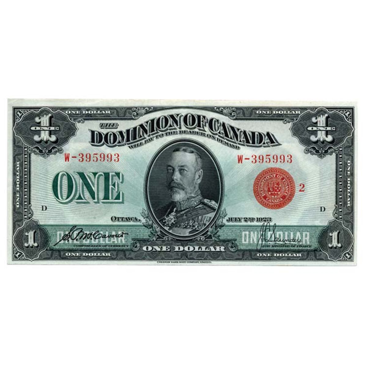 $1.00. July 2, 1923. DC-25g. Red Seal. No. W-395993/D. PCGS graded Unc-62.