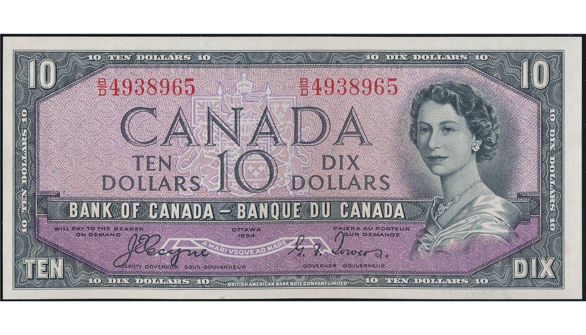 $10.00. 1954 Issue. BC-32a. No. B/D4938965. Coyne-Towers. 'Devil's Face'. Unc.