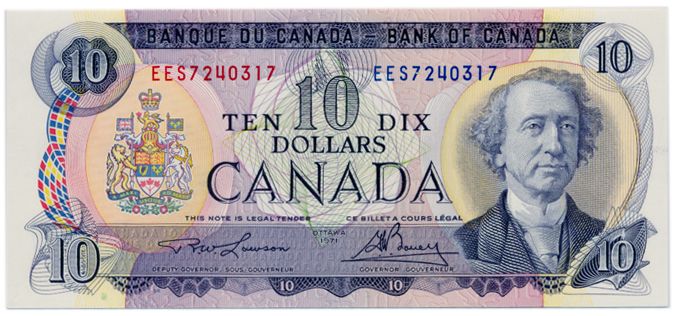 $10.00. 1971 Issue. BC-49c-i. Lawson-Bouey. No. EES7240317. BCS graded Choice Unc-64. Original. The FINEST of three (3) known examples with the EES prefix and the Lawson-Bouey signature combination.