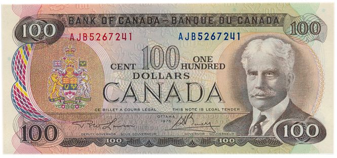 $100.00. 1975 Issue. BC-52a-i. No. AJB5267241. Lawson- Bouey. CCCS graded Choice Unc-64.