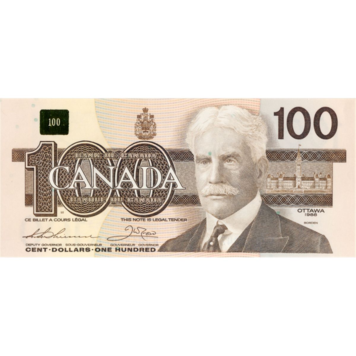 $100.00. 1988 Issue. BC-60a-i. Thiessen-Crow. Clear B.P.N. No. BJD6504716. CCCS graded Gem UNC-65.