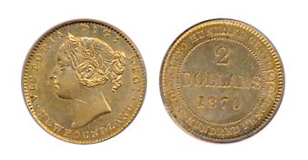 1870. Obv. port. #1. (3 Dot variety). PCGS graded AU-58. Brilliant yellow luster.