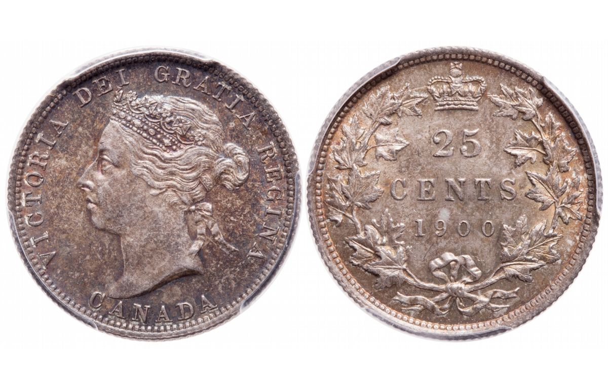1900. PCGS graded Mint State-63. Medium 'P.Q.' toning in grays and blues.