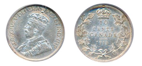 1913. Broad Leaves. ICG graded AU-55. A mostly brilliant, lightly circulated example of the 'key' date of the George V ten cents pieces.