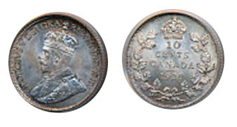 1920. PCGS graded Mint State-66. Light purple toning over superb fields with full underlying lustre characterizes this gem George V ten cents piece. Tied for the second ‘finest’ graded by PCGS.