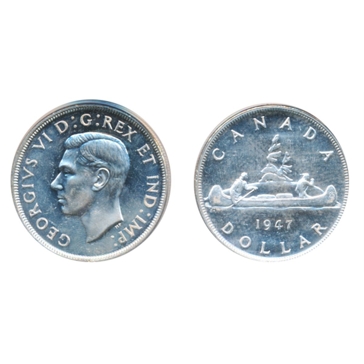 1947. Blunt 7. Single ‘H.P.’ variety. PCGS graded Mint State-63. A brilliant silver dollar.