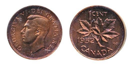 1952. ICCS Mint State-65. Red. Lightly lacquered. 80% red luster.