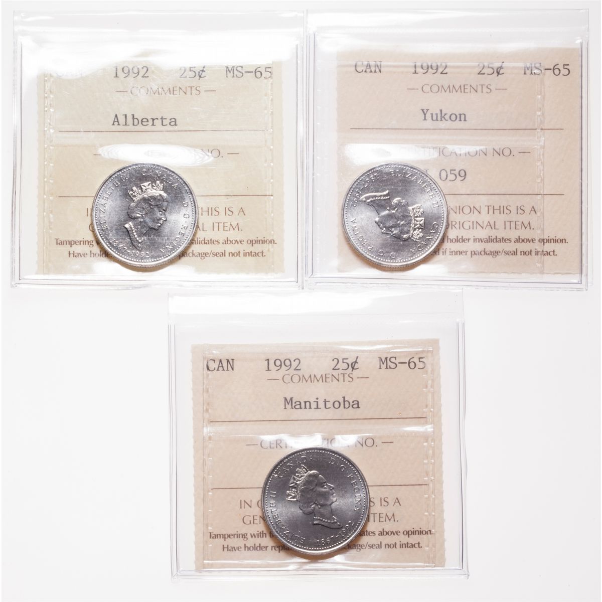 1992. Manitoba; 1992. Yukon; 1992. Alberta. All three (3) are ICCS Mint State-65. Lot of three (3) Gems.