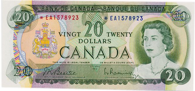 $20.00. 1969 Issue. BC-50aA. No. *EA1578923. Beattie- Rasminsky. BCS graded Original Unc-63.