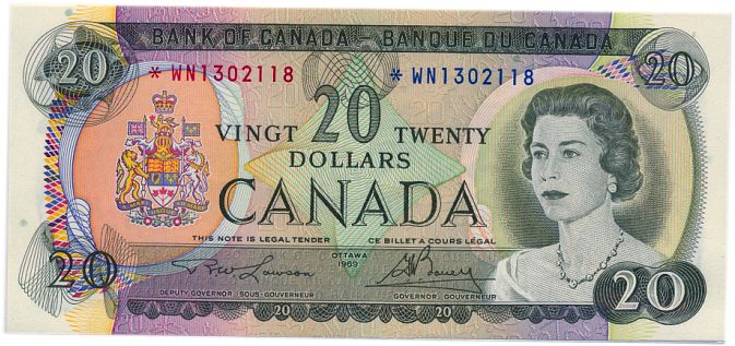 $20.00. 1969 Issue. BC-50bA. Lawson-Bouey. No. *WN1302118. CCCS graded Unc-60.