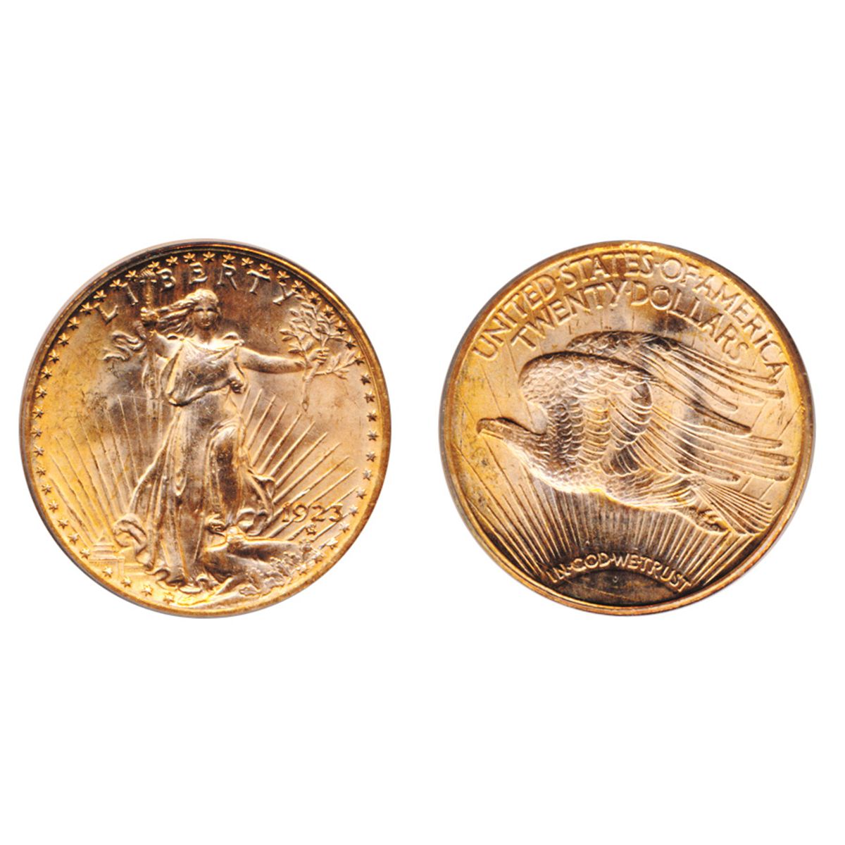 $20.00 Gold. 1923. St. Gaudens. PCGS graded Mint State-64. Brilliant golden luster.