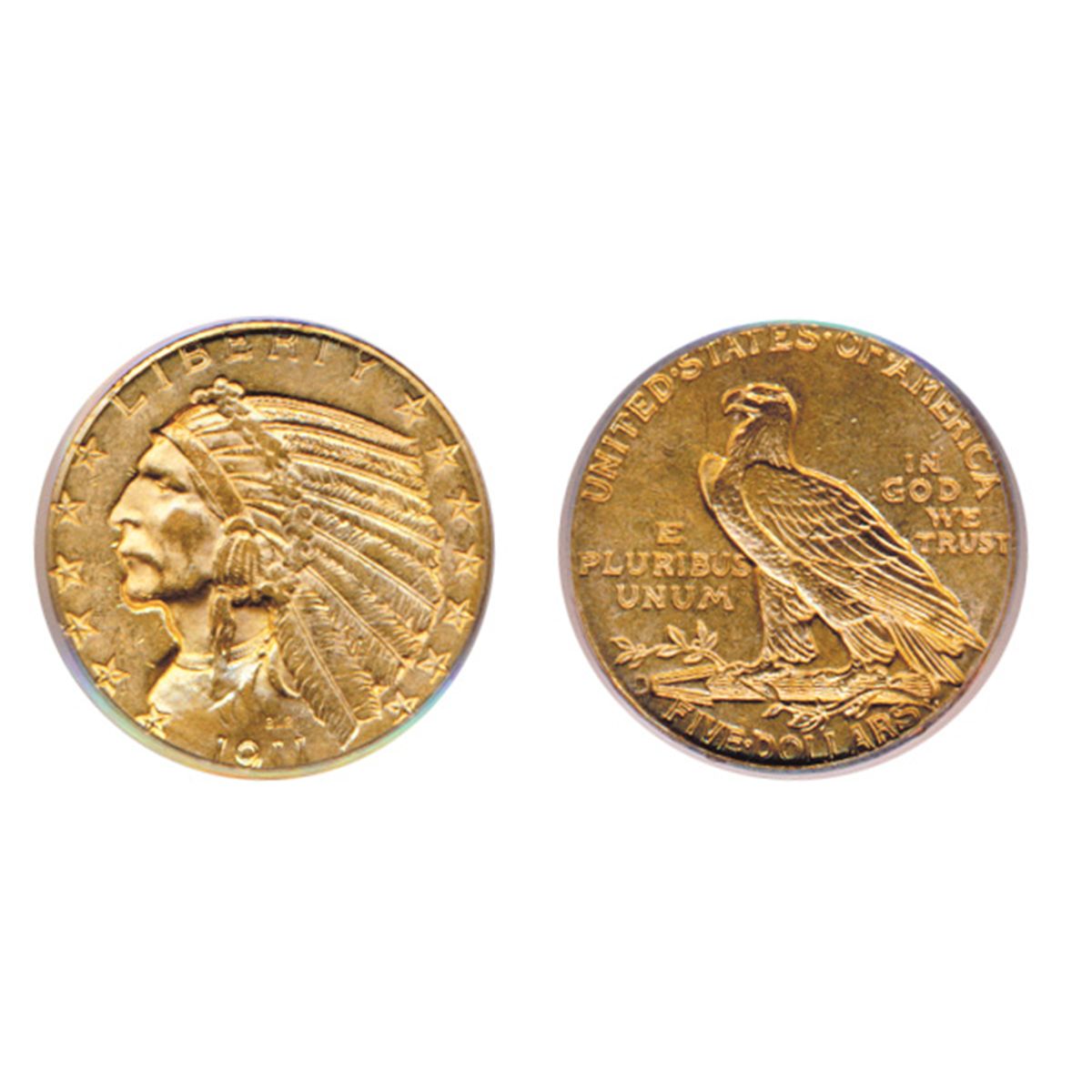 $5.00 Gold. 1911-S. Indian. PCGS graded AU-58. Brilliant golden luster.