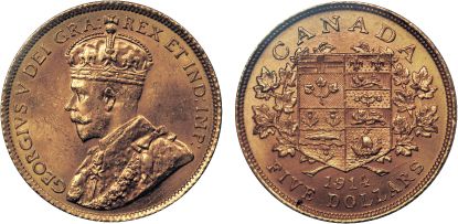 $5.00 Gold. 1914. Mint State-63. An original, pristine gold coin. The final issue of the series and the ‘key’ date. Full lustre, excellent fields and very good ‘eye appeal’.