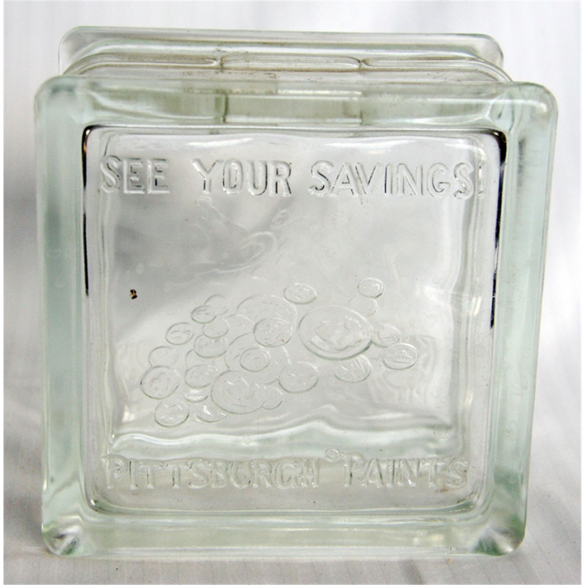 A Glass Block bank. See Your Savings, Pittsburgh Paints. 12cm x 12cm x 8cm. Glass. VF.