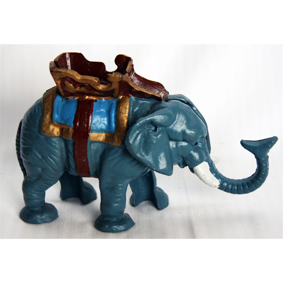 A Mechanical bank shaped like an Elephant. Trunk shots coin into slot on back. 16cm x 13cm x 6cm. Cast iron, with gray, red & gold finish. EF.