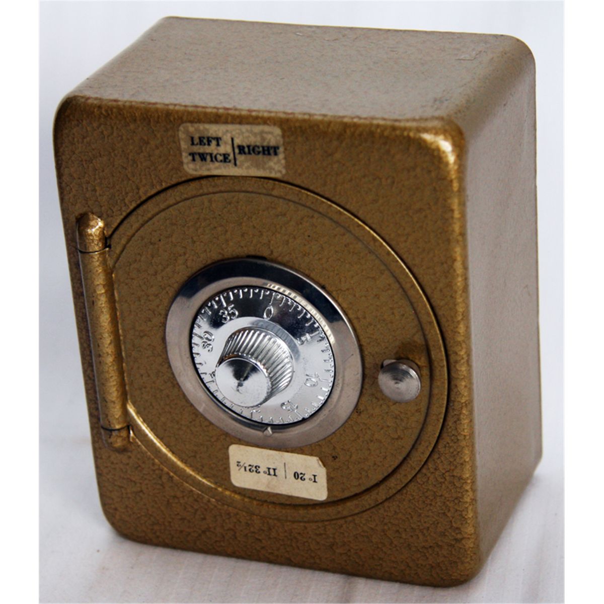 A Safe or Vault shaped bank. Coin slot on back. 10cm x 6cm x 12cm high. Steel, with a gold finish, and a dial on front. EF.