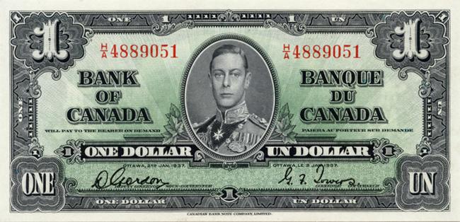 BANK OF CANADA. $1.00. 1937 Issue. BC-21b. Gordon-Towers. Narrow Panel. No. H/A4889051. Choice Unc-63. Ex. Torex. June 15-16, 2001. Lot #214.