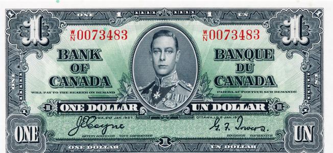 BANK OF CANADA. $1.00. 1937 Issue. BC-21d. No. W/N0073483. PCGS graded Unc-63. PPQ.