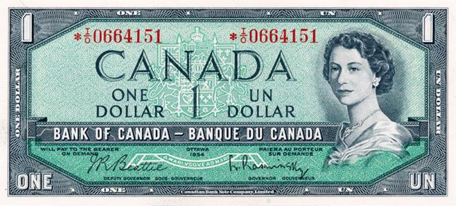 BANK OF CANADA. $1.00. 1954 Issue. BC-37bA. Modified. No. *I/O0664151. PCGS graded Choice AU-58.