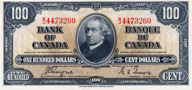 BANK OF CANADA. $100.00. 1937 Issue. BC-27c. Coyne-Towers. No. B/J4473260. PMG graded AU-55. EPQ.