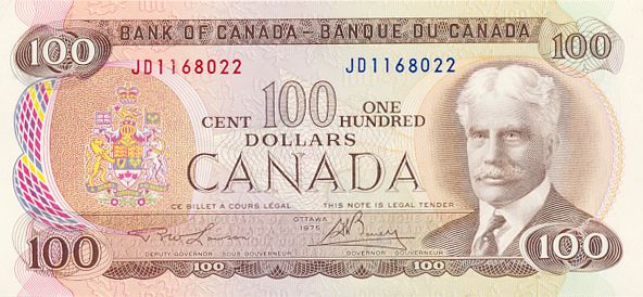 BANK OF CANADA. $100.00. 1975 Issue. BC-52a. Lawson- Bouey. No. JD1168022. CCCS graded AU-55. A short series.