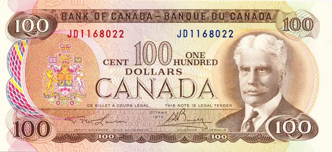 BANK OF CANADA. $100.00. 1975 Issue. BC-52a. Lawson-Bouey. No. JD1168022. CCCS graded AU-55. A short series.