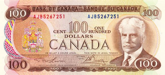 BANK OF CANADA. $100.00. 1975 Issue. BC-52a-i. Lawson-Bouey. No. AJB5267251. CCCS graded Choice Unc-64.