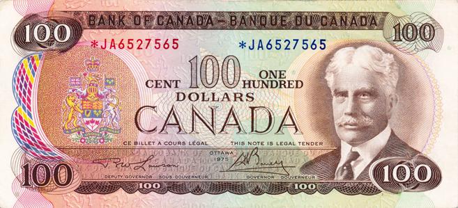 BANK OF CANADA. $100.00. 1975 Issue. BC-52aA. Lawson-Bouey. No.*JA6527565. PCGS graded Very Fine-35. PPQ.