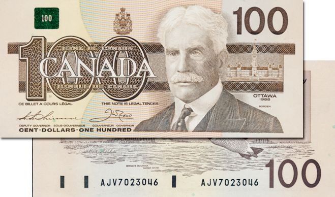 BANK OF CANADA. $100.00. 1988 Issue. BC-60a. No. AJV7023046. H.B.P. #95. CCCS graded Gem Unc-65.