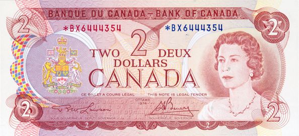 BANK OF CANADA. $2.00. 1974 Issue. BC-47aA. Lawson- Bouey. No. *BX6444354. PCGS graded Unc-66 PPQ.