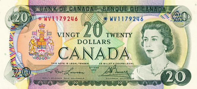 BANK OF CANADA. $20.00. 1969 Issue. BC-50aA. No. *WV1179246. PCGS graded AU-53. PPQ.
