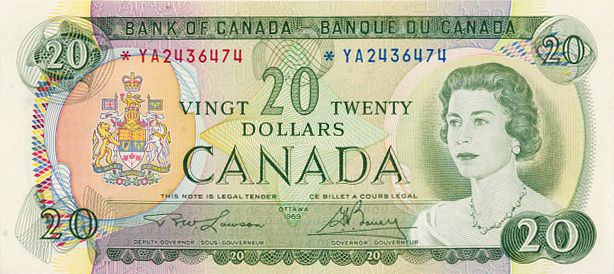 BANK OF CANADA. $20.00. 1969 Issue. BC-50bA. Lawson- Bouey. No. *YA2436474. CCCS graded AU-58.