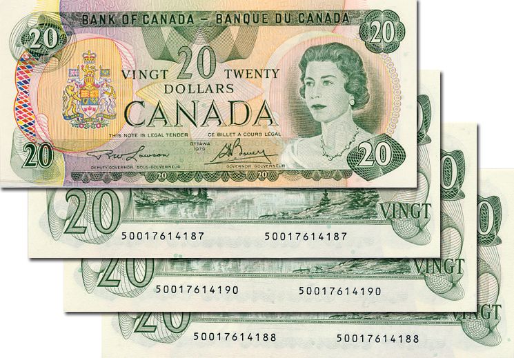 BANK OF CANADA. $20.00. 1979 Issue. BC-54a. Lawson-Bouey. No.’s 50017614187, 50017614188, 5001761419