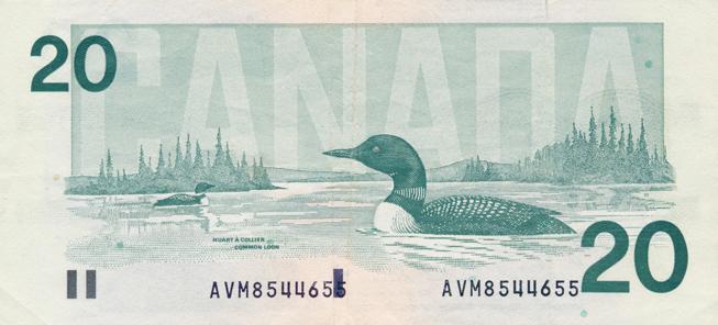 BANK OF CANADA. $20.00. 1991 Issues. BC-58b. No. AVM8544655. PMG graded Very Fine-25. S/N Misalignment error.