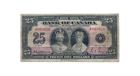 BANK OF CANADA. $25.00. 1935 Issue. BC-11. English Text. No. A008058/A. PMG graded Fine-15. An affordable example.