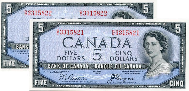 BANK OF CANADA. $5.00. 1954 Issue.BC-31b. 'Devil's Face'. Beattie-Coyne. No. G/C3315821 & G/C3315822. Lot of two (2) consecutive Choice Unc. Notes.
