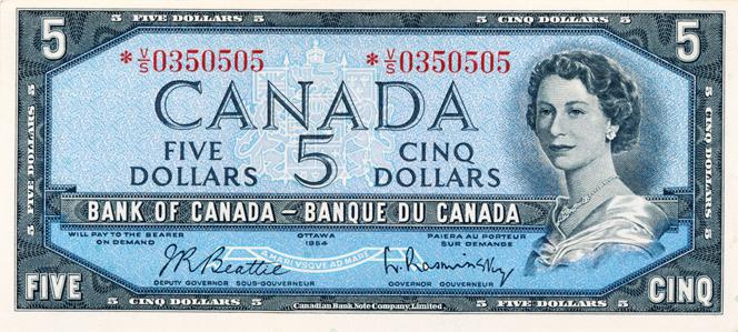 BANK OF CANADA. $5.00. 1954 Issue. BC-39bA. Modified. No. *V/S0350505. PCGS graded AU-55. PPQ.
