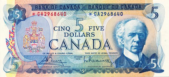BANK OF CANADA. $5.00. 1972 Issue. BC-48aA. Bouey-Rasminsky. No. *CA2968640. PCGS graded CH AU-58; No. *CD3061866. PCGS graded AU-50. Lot of two (2) notes.