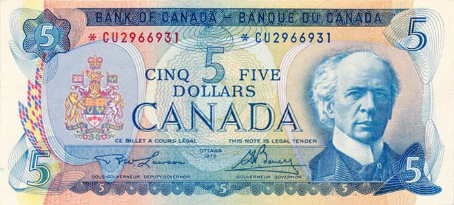 BANK OF CANADA. $5.00. 1972 Issue. BC-48aA. Bouey-Rasminsky. No. *CU2966931. PCGS graded Very Fine-35. PPQ; BC-48bA. No. *SB1158921. PCGS graded CH AU-58. PPQ. Lot of two (2) notes.