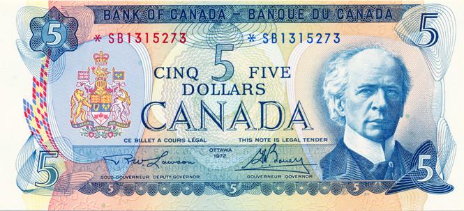 BANK OF CANADA. $5.00. 1972 Issue. BC-48bA. Lawson-Bouey. No. *SB1315273. PCGS graded Unc-63. PPPQ.