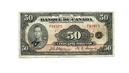 BANK OF CANADA. $50.00. 1935 Issue. BC-14. French Text. No. F01975/A. PMG graded Very Fine-20. A rare and high grade French example.