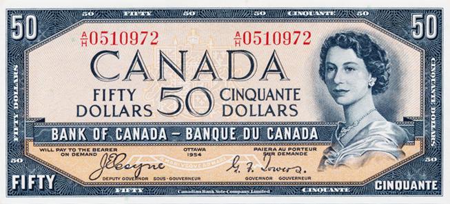 BANK OF CANADA. $50.00. 1954 Issue. BC-34a. 'Devil's Face'. Coyne-Towers. No. A/H0510972. Ex. Thomas Flynn collection. No. AH-510972. PMG graded Choice Unc-64.