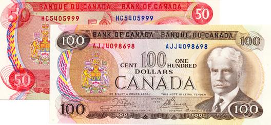 BANK OF CANADA. $50.00. 1975 Issue. BC-51a. Lawson-Bouey. No. HC405999. AU; $100.00. 1975 Issue. BC-52b. No. AJ4098698. CU. Lot of two (2) notes.
