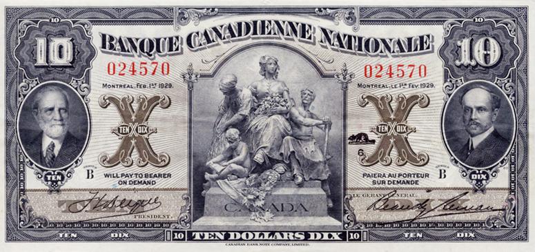 BANQUE CANADIENNE NATIONALE. $10.00. Feb. 1, 1929. CH-85-12-04. No. 024570. PMG graded Very Fine-30. EPQ.