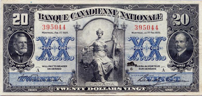 BANQUE CANADIENNE NATIONALE. $20.00. Feb. 1, 1925. CH-85-20-06. No. 395044. PMG graded Very Fine-25. The second finest of twelve notes listed in the census.