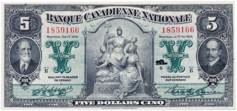 BANQUE CANADIENNE NATIONALE. $5.00. Feb.1, 1929. CH-85- 12-02. No. 1859166. PCGS graded Very Fine-35 PPQ.