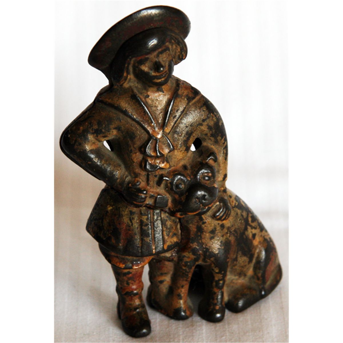 BUSTER BROWN AND TIGE, (1918-1930). Similar to the Beaverton Toy Co., Beaverton, Ont. bank. Coin opening on top. 13 cm high. Cast iron with black finish of comic character Buster Brown and his dog tige. ‘Made in Canada’ embossed on the rear of Tige. Fine.