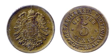 Breton-586. LeRoux Coin Cabinet. English. ICCS Mint State-62. Breton-589. Gesangverein. 5 Cents. Arms. Brass. ICCS AU-55. Lot of two (2) tokens.