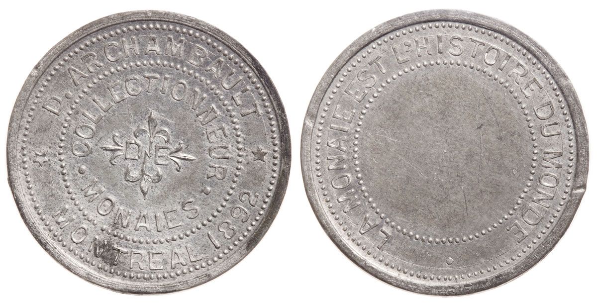 D'Archambault – Montreal – 1892; One of only 12 struck with the error in spelling Monnaie with only "one" N. ICCS graded Unc-60. No centre design, one side only. Ex Temple.