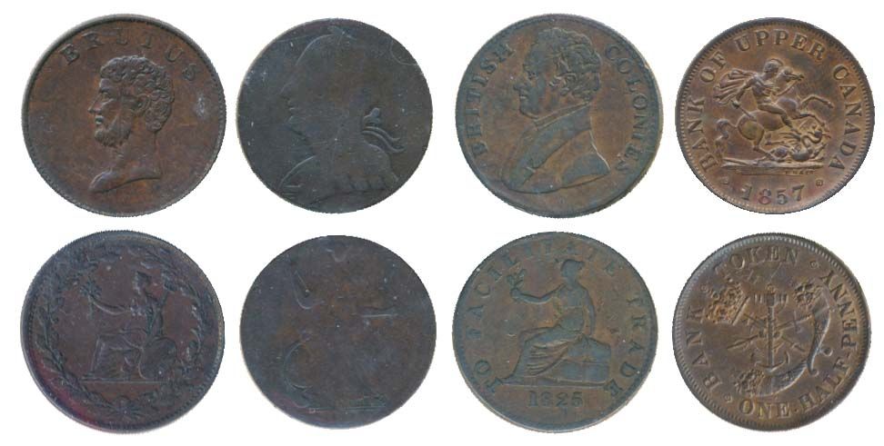 PC-5D. 1857. 1/2 Penny token. ICCS Mint State-60. 50% lustre; Breton-993. British Colonies. 1/2 Penny. ICCS Very Fine-30; Blacksmith token. Wood-11. BL7. ICCS Fine-12; Brutus token. BH-11. 1/2 Penny. No date (c.1812). Good Very Fine. Lot of four (4) token